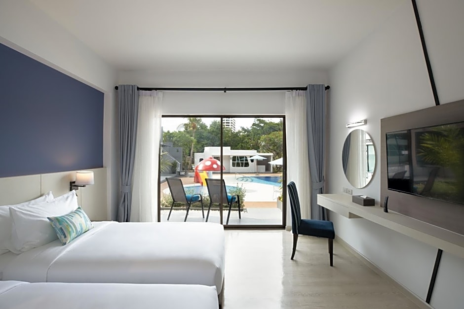 Indulge in our Deluxe Twin Room with Pool Access, a spacious retreat spanning 301 sqft. Unwind on the balcony, enjoy the cool air conditioning, and take advantage of the refreshing pool just steps away. Perfect for a family of 4, this room offers a comfortable stay with twin beds, a refrigerator, and a tea/coffee maker.